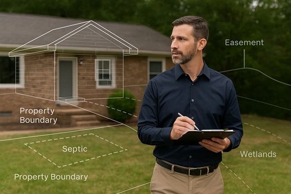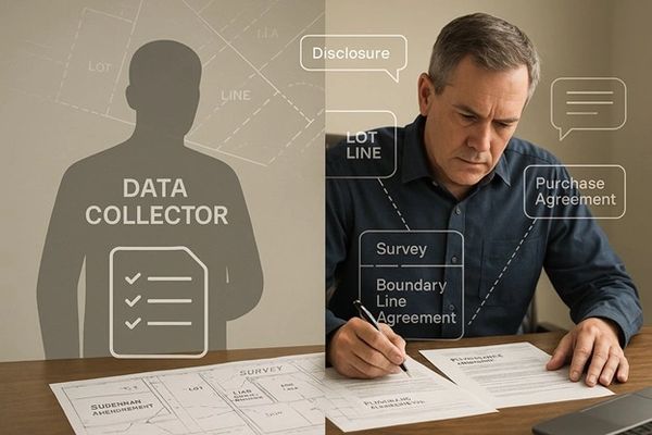 Much of our work occurs after the inspection in Standard 2. We verify legal descriptions, compare parcels to plats and survey maps, and analyze the full purchase and sale agreement. In many files we receive a shortened contract that omits addenda or contingencies, so we reconstruct the complete terms to determine whether the parties are fully informed. We also test for proposed changes that are not yet recorded, including lot line adjustments, boundary line agreements, or surveys in progress.